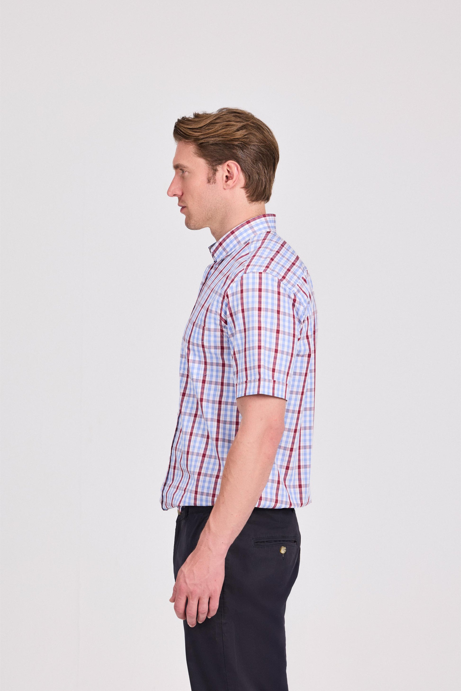 Elevate your wardrobe with our meticulously crafted checkered Short Sleeve Shirt. Fashioned from premium 100% cotton, this refined garment offers exceptional breathability and comfort while maintaining its distinguished appearance throughout the day. The classic checkered pattern provides versatile styling options for both casual and semi-formal occasions.